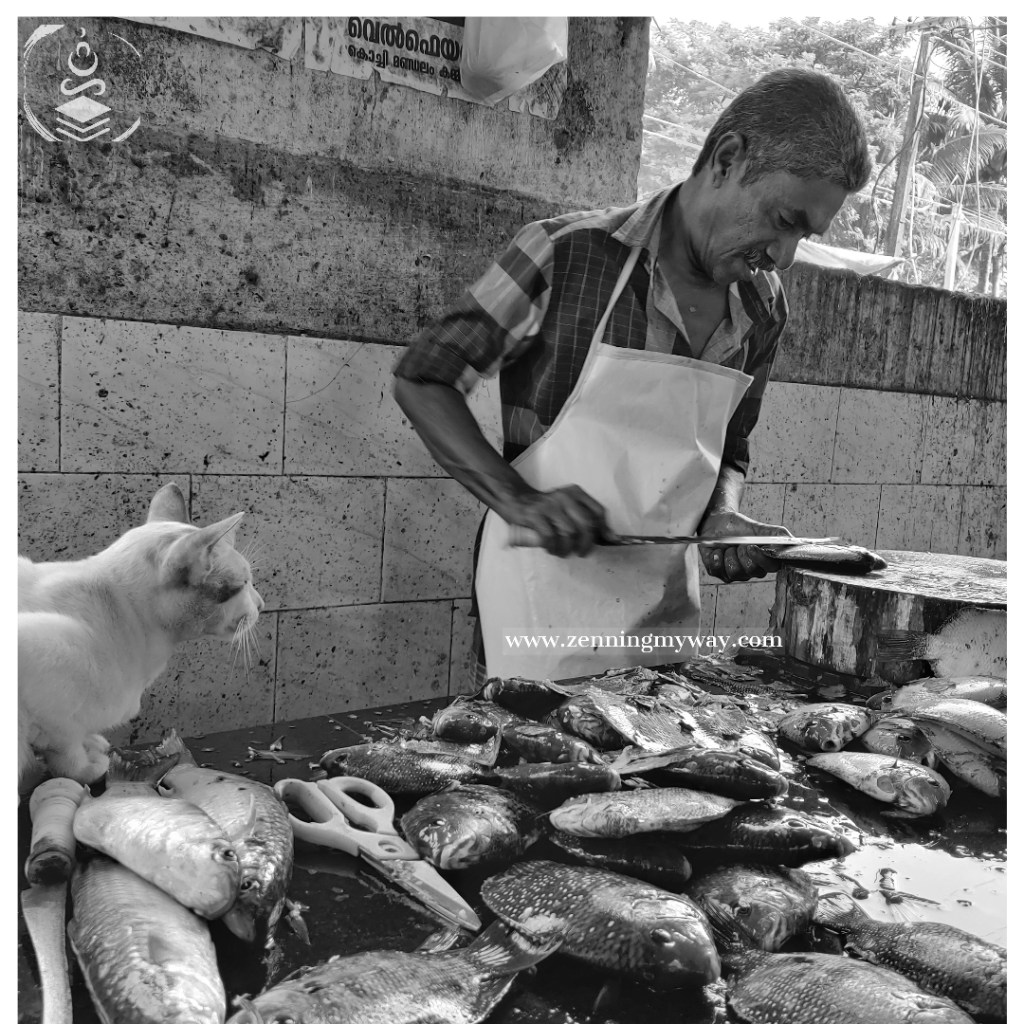 This is a photograph of deep philosophical interest for me. The cat is patiently waiting for it to be fed despite having a seemingly abundant choice of fish right in front of her. So, is the cat Zen enough or is it just a deep rooted conditioning? On the other hand, the butcher is slicing open the carcass of a fish with a little smile, is he smiling because he gets a sadistic pleasure or is it because he is so involved in what he is doing that he feels it is almost artistic, something like Zen. On the third part, me the observer what do I see? Picture taken in the markets fo Cochin. September 2019.